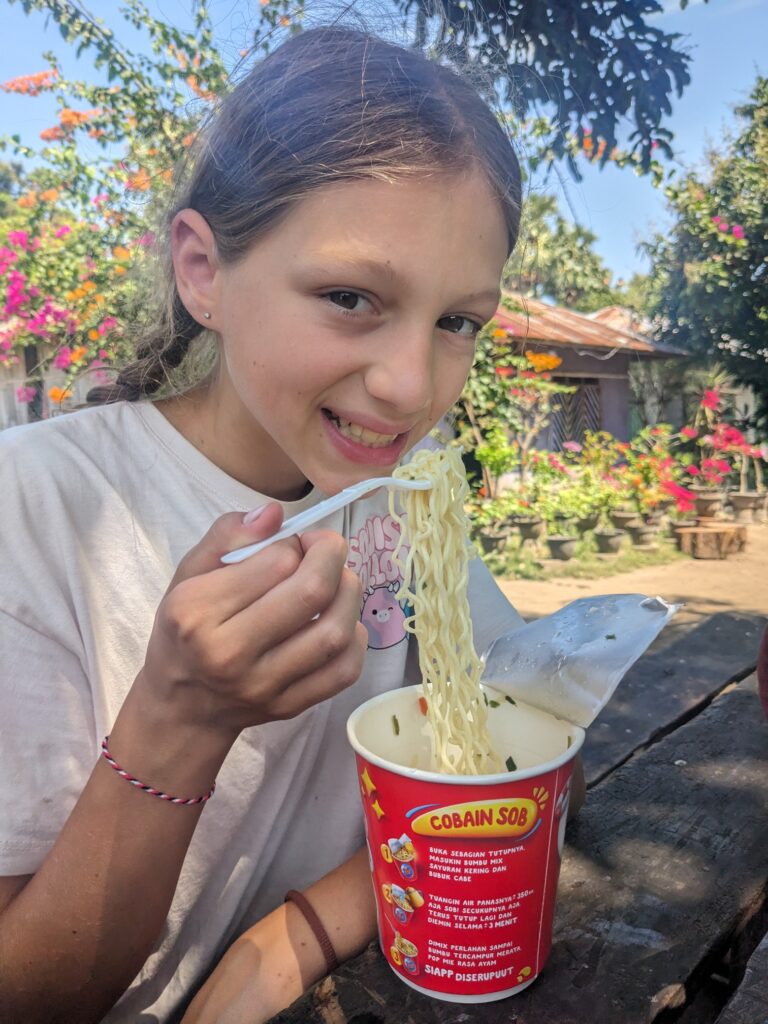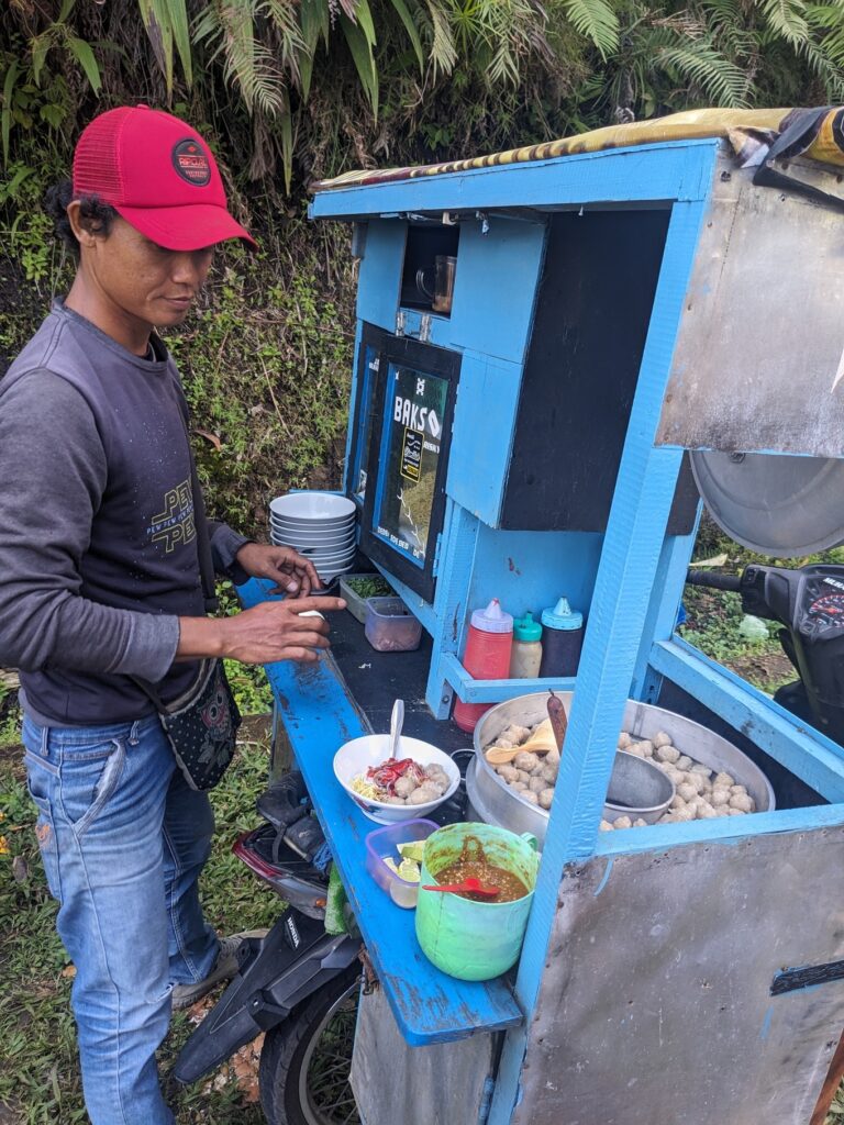 Nous ne sommes pas au bout de nos peines car après 25 km, nous nous retrouvons bloqués par des travaux sur la route. Les camions benne font des allers-retours pour dégager la terre, en attendant on discute avec une autre famille française et on mange nos premiers bakso.