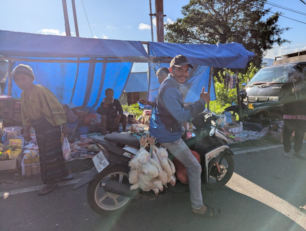 Après ce beau début de journée, on s’arrête au marché installé sur les bords de la route (donc c’est bien le bazar) pour se ravitailler en légumes. Les poulets attachés au scooter sont vivants !