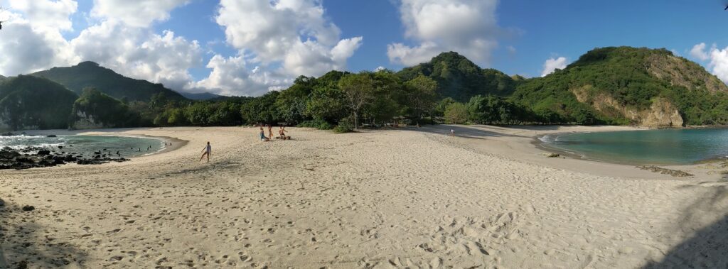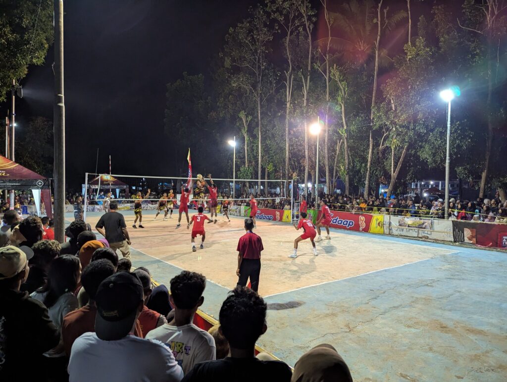On trace ensuite vers le nord car on a quasiment 2h de route. L’idée est d’aller à Pantai Watulajar pour trouver un logement et finir la journée sur la plage. Malheureusement il n’y a plus rien de dispo. On nous propose une maison en fin de construction, nos amis acceptent, mais cela est trop rudimentaire pour nous. Pas de douche (juste à l’écuelle), la maison est quasi vide à part deux matelas. Donc de notre côté on pousse jusqu’à Riung 1/2h plus loin. On arrive à la tombée de la nuit et on trouve un hôtel plutôt rapidement. Après une bonne douche, on va diner dans un warung. Il y a beaucoup de monde et d’ambiance dans les rues car il y a des matchs de volley !