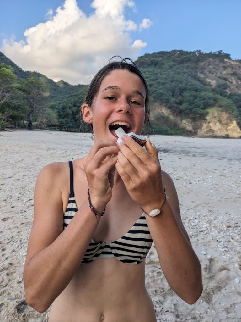 La baignade est bonne, ainsi que les noix de coco trouvées sur place !