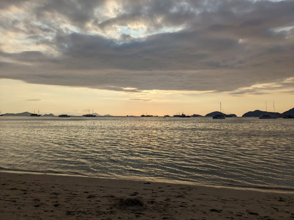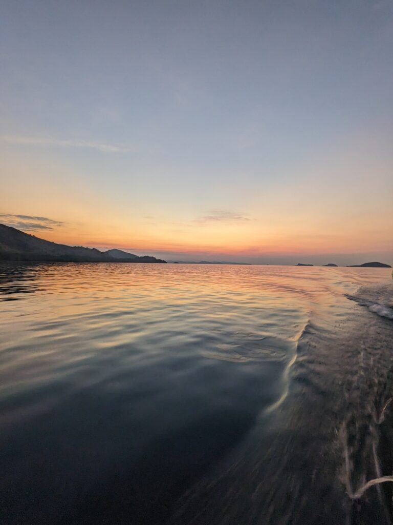 La route est longue jusqu’à Labuan Bajo (3h pour faire 100 km). On s’arrête à la plage juste à côté de notre hôtel pour se rafraîchir et profiter de la belle lumière du soir avant de rendre les voitures.