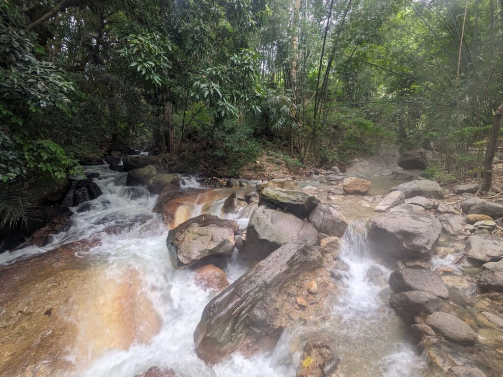 On finit la journée aux sources chaudes de Malanage : à gauche le torrent d’eau froide, à droite le torrent d’eau bouillante, au milieu, un bon bain bien chaud.