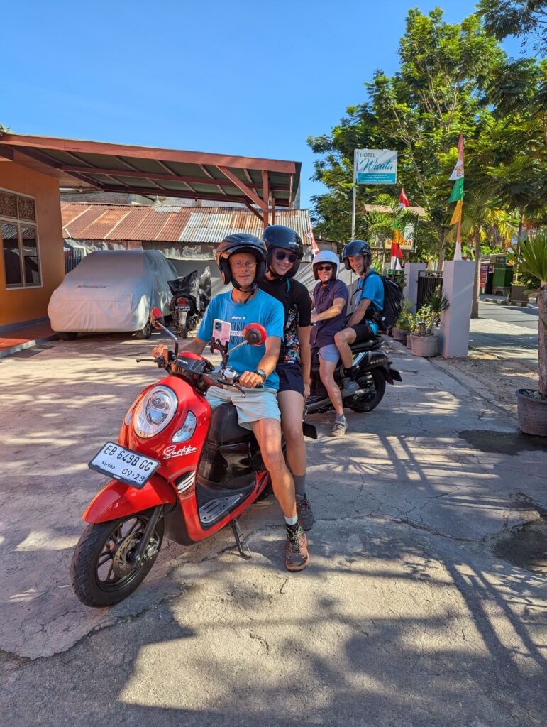 Aujourd’hui on loue des scooters ! Première expérience de conduite pour Domitille qui n’est pas super rassurée. Elle prend Margot derrière elle mais après une chute sans complication Margot ira avec Nico et Jeanne !