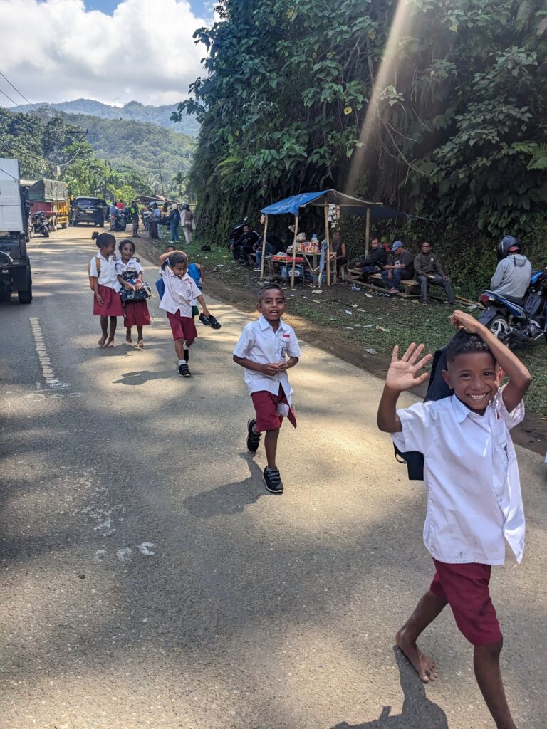 Puis peu de temps avant de revenir à Ende, nous sommes à nouveau bloqués sur le même barrage qu’hier… Mais cette fois nous attendons seulement 1h avant de pouvoir passer, sur une voie. On est chanceux parce qu’hier ils ont fait passer ceux qui montaient en premier (donc nous) et aujourd’hui ceux qui descendent !