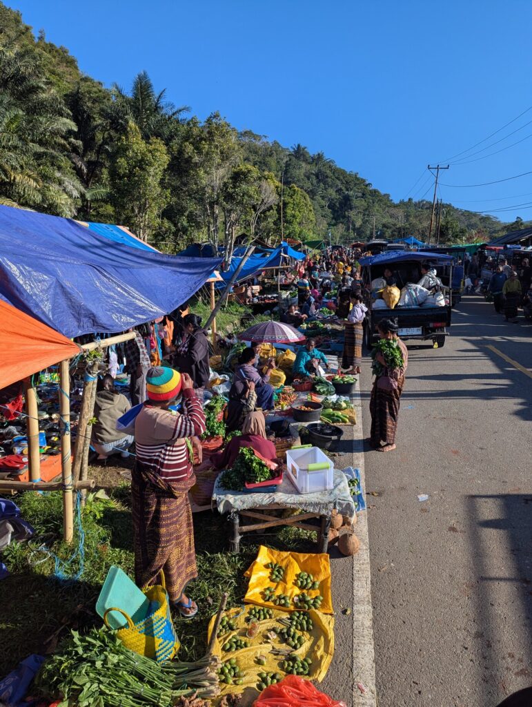 Après ce beau début de journée, on s’arrête au marché installé sur les bords de la route (donc c’est bien le bazar) pour se ravitailler en légumes. Les poulets attachés au scooter sont vivants !