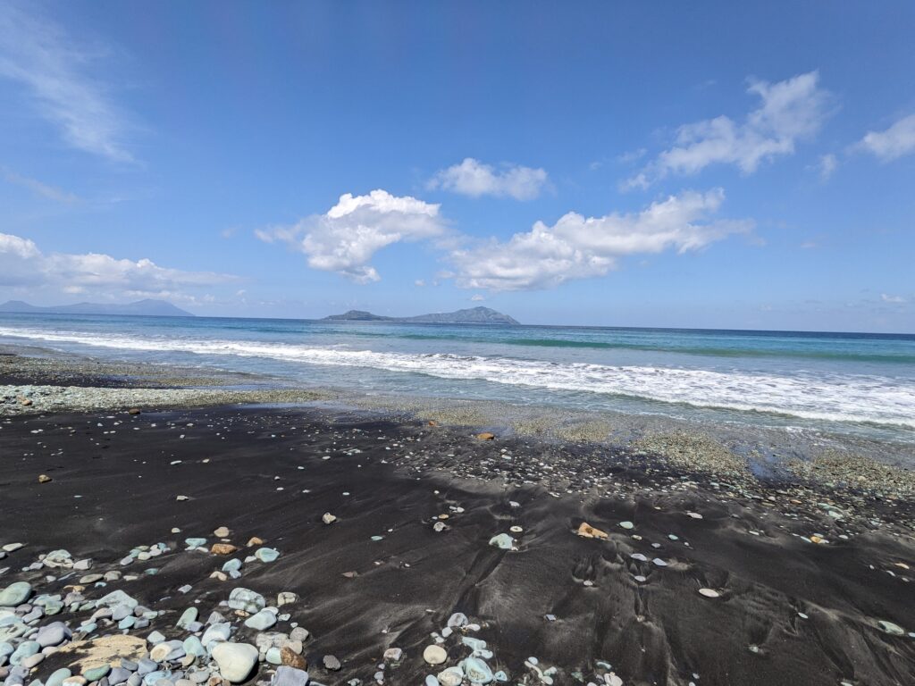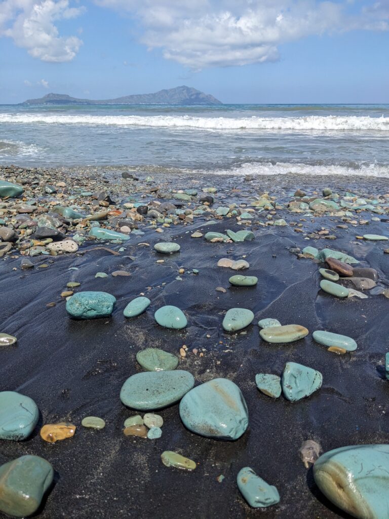 Passé Ende nous longeons la côte avec ses belles plages de sable noir et nous nous arrêtons à l’une de celle où on trouve des galets bleus !