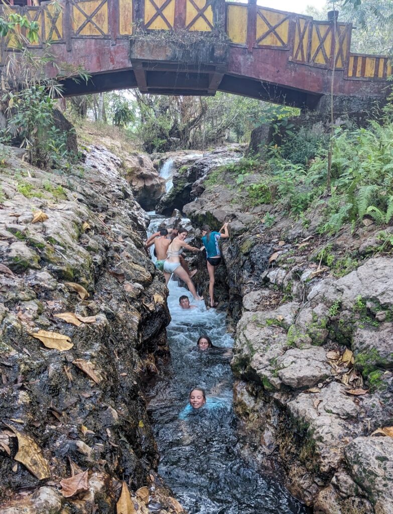 Choisissez entre le petit torrent avec courant à 40-45°C ou les petits bassins à 50-60°C. Encore faut-il arriver à y entrer, surtout quand tu as pris des coups de soleil la veille 🙈