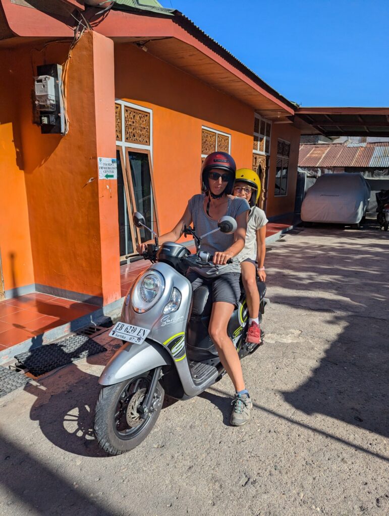 Aujourd’hui on loue des scooters ! Première expérience de conduite pour Domitille qui n’est pas super rassurée. Elle prend Margot derrière elle mais après une chute sans complication Margot ira avec Nico et Jeanne !