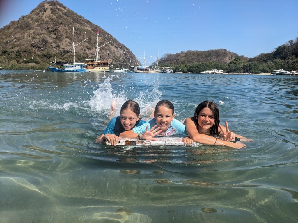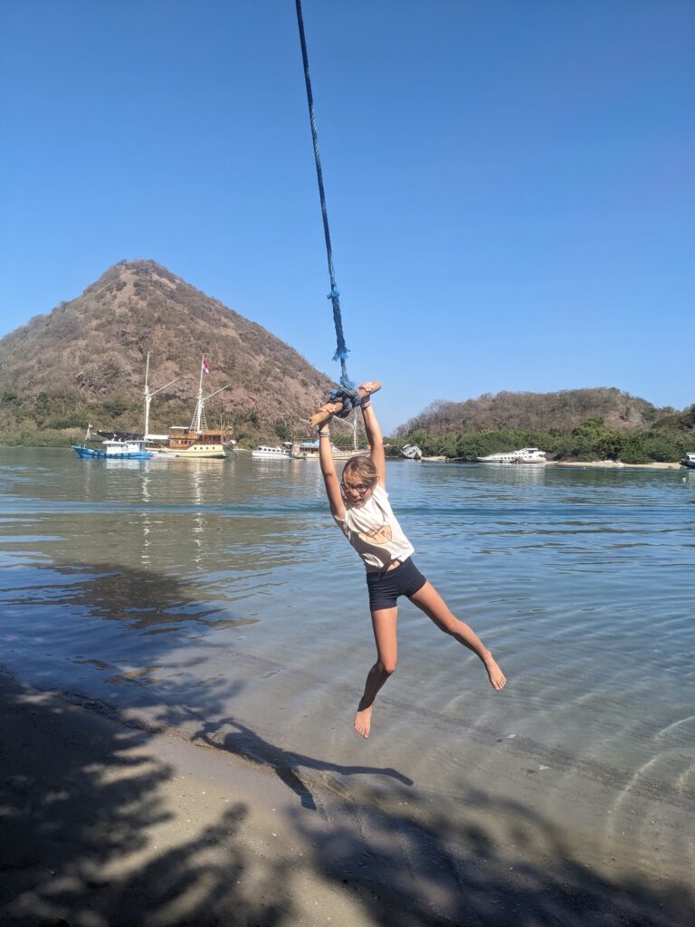 La route est longue jusqu’à Labuan Bajo (3h pour faire 100 km). On s’arrête à la plage juste à côté de notre hôtel pour se rafraîchir et profiter de la belle lumière du soir avant de rendre les voitures.