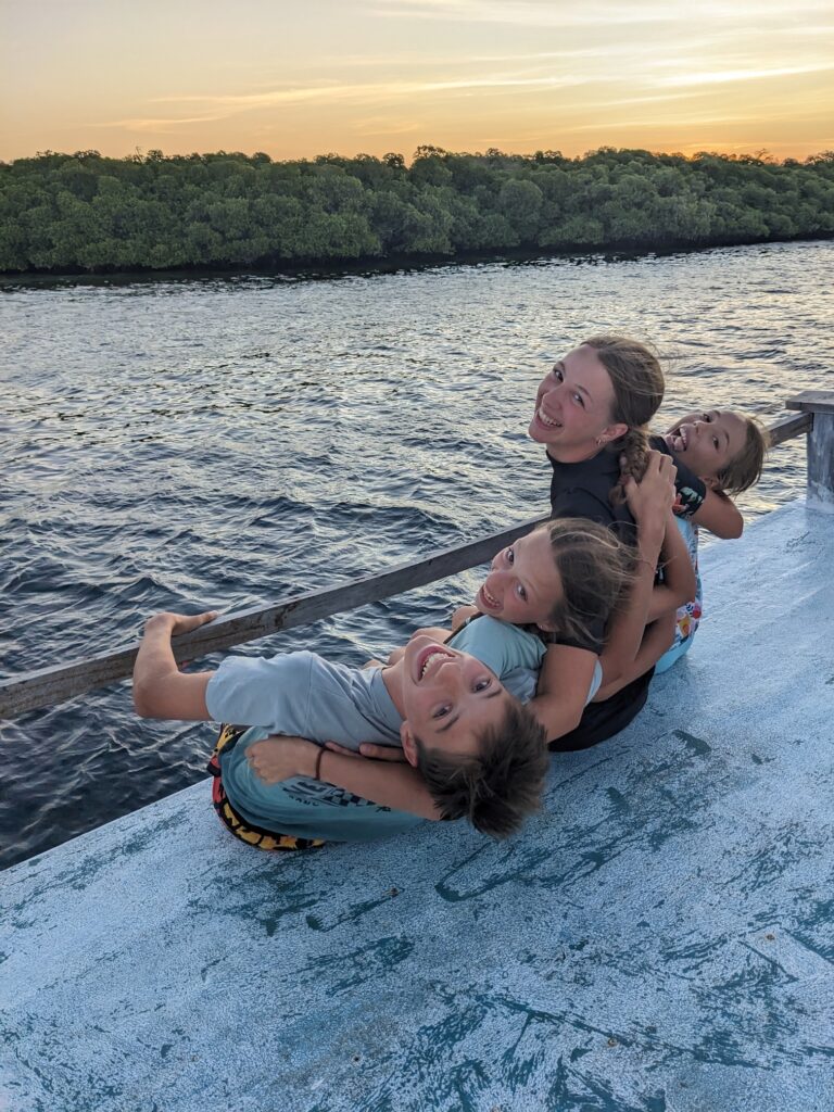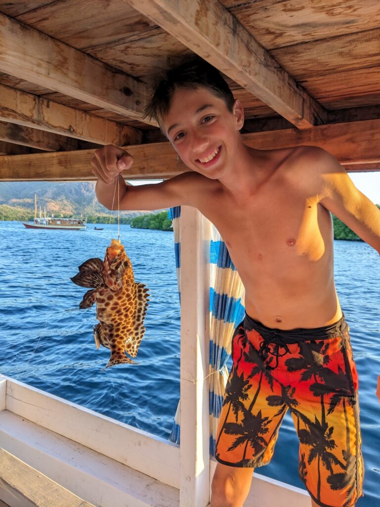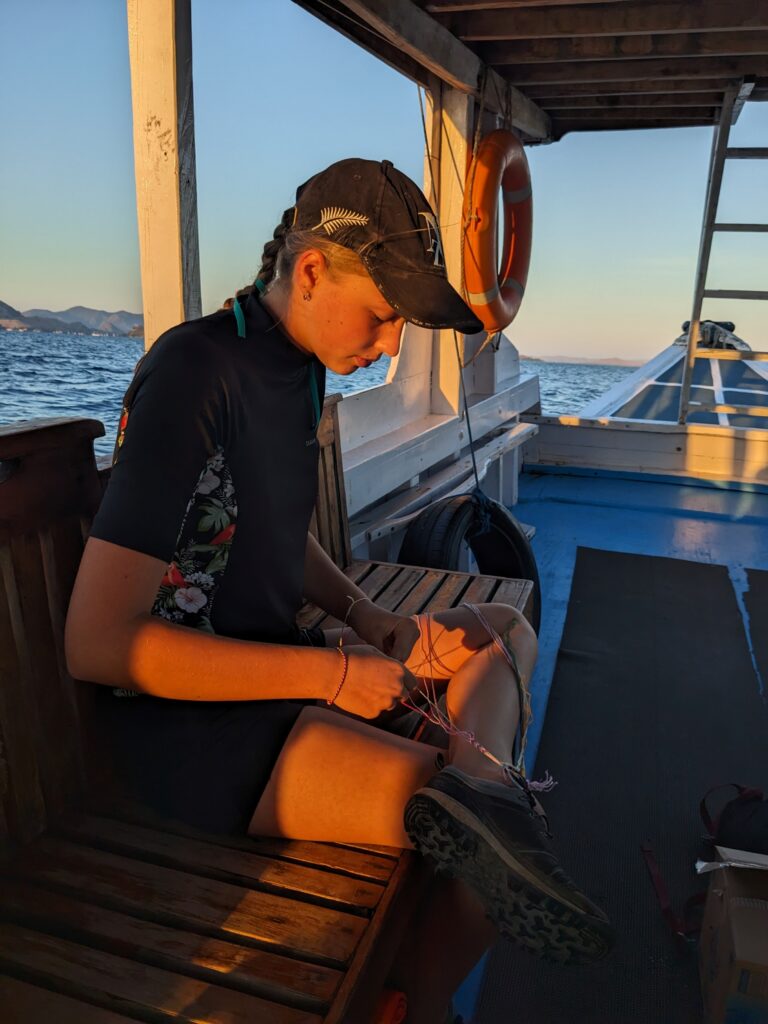 Nous reprenons ensuite notre navigation jusqu’à Kalong Island. En attendant le coucher de soleil de ce soir qui s’annonce un peu particulier, on s’occupe : baignade, sauts, fabrication de bracelets et même pêche !