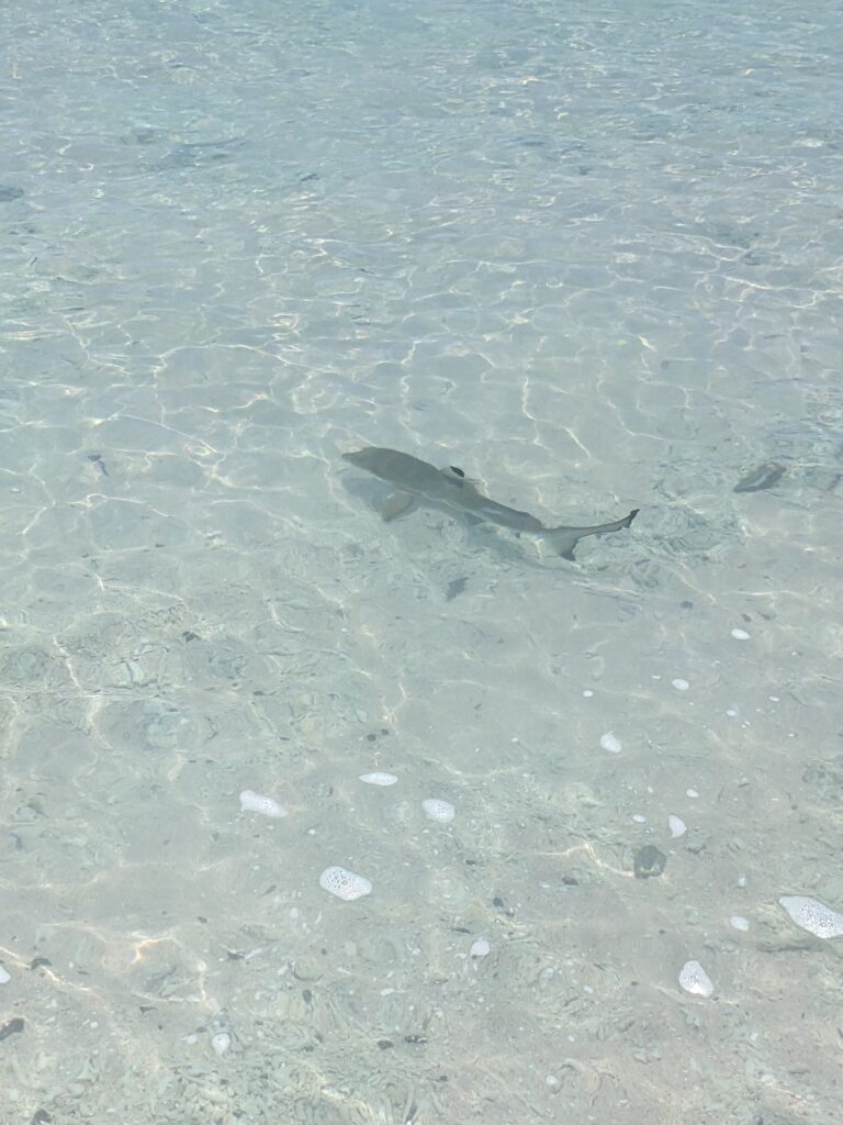 Au moment de repartir, on voit un bébé requin à pointe noire, juste au bord de l’eau !