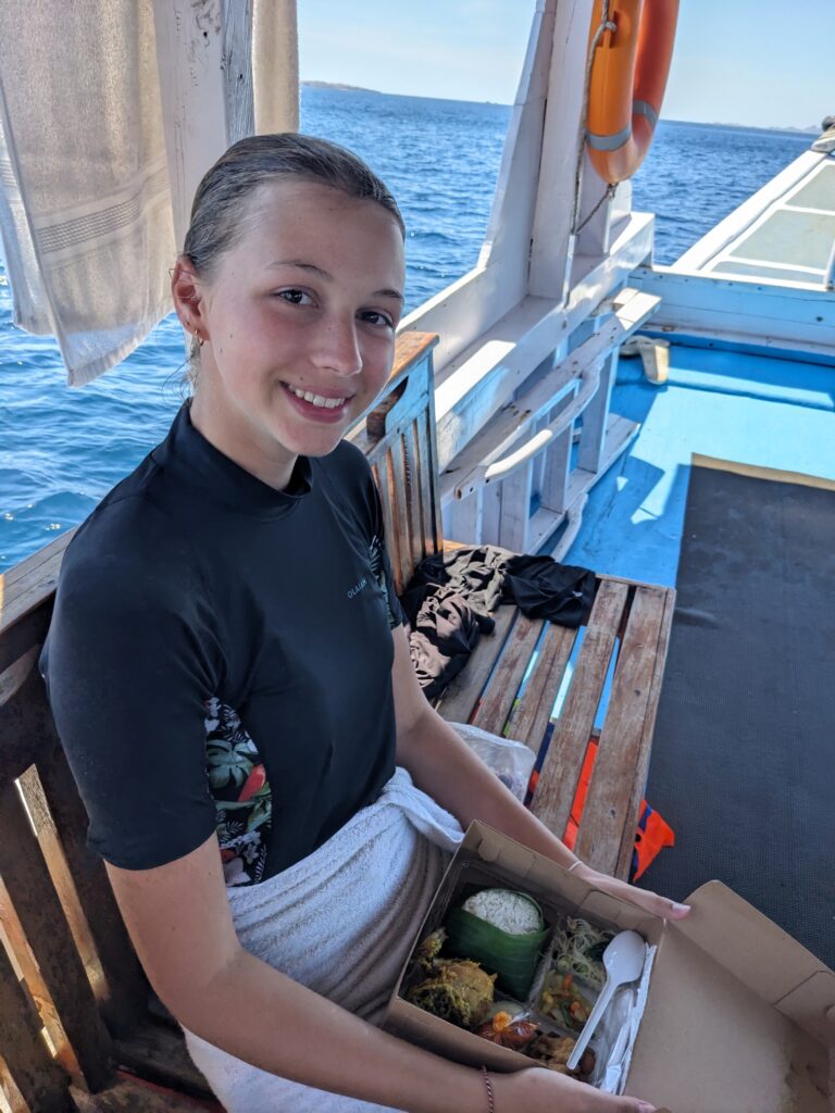 Le trajet jusqu’à Rinca prend environ 1h30. Encore une fois on profite de notre chouette bateau, et d’un succulent déjeuner.