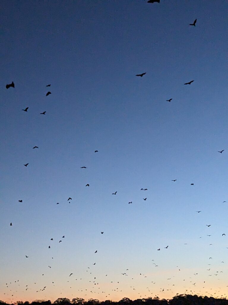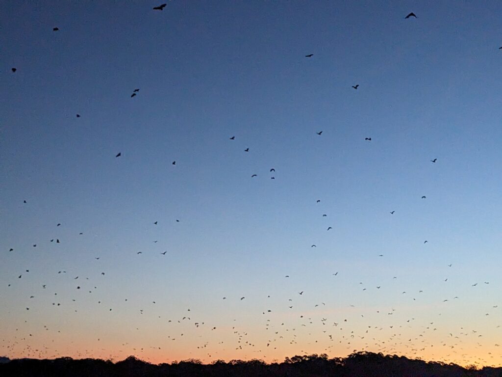 C’est un flot infini de chauve-souris qui nous survolent ! Nous n’attendons pas la fin car cela peut durer en continu pendant encore 3h !