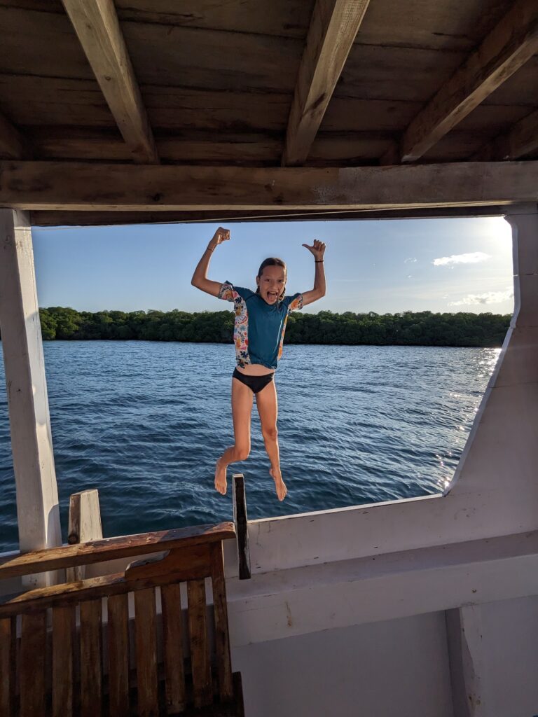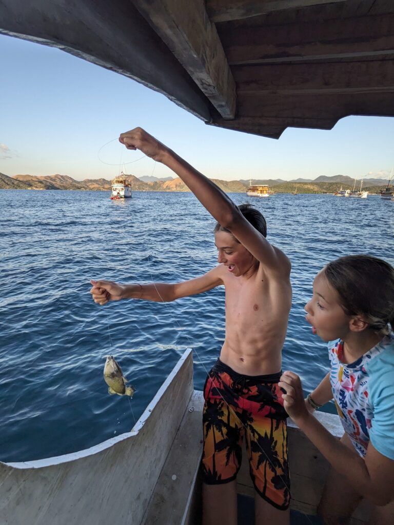 Nous reprenons ensuite notre navigation jusqu’à Kalong Island. En attendant le coucher de soleil de ce soir qui s’annonce un peu particulier, on s’occupe : baignade, sauts, fabrication de bracelets et même pêche !