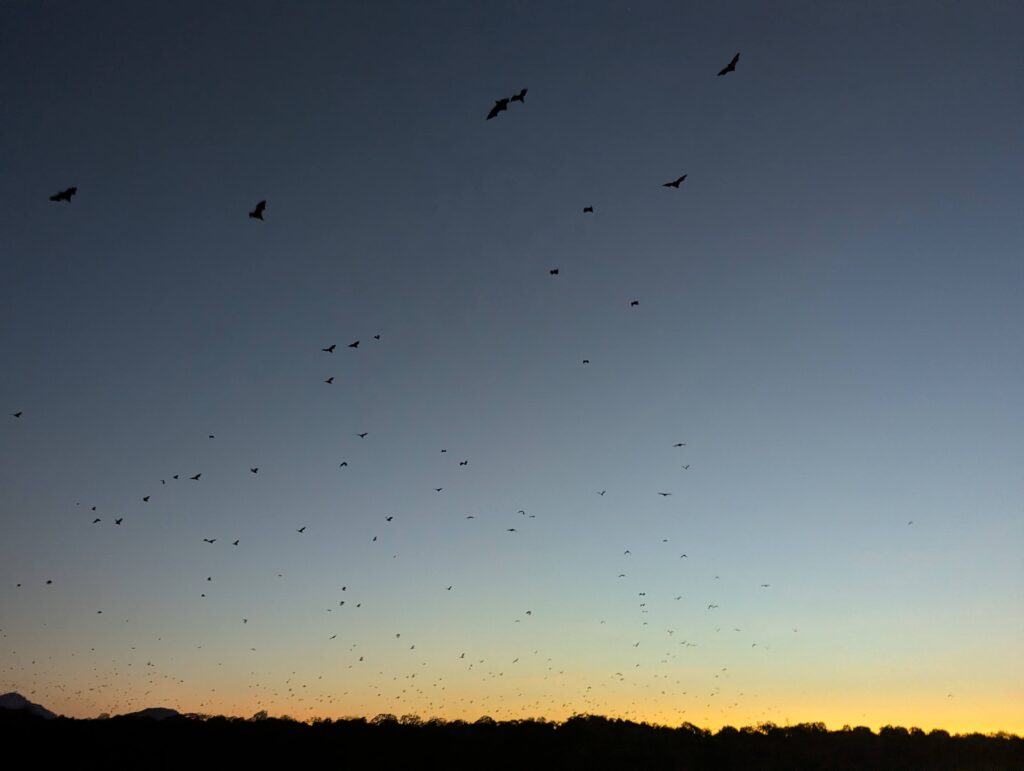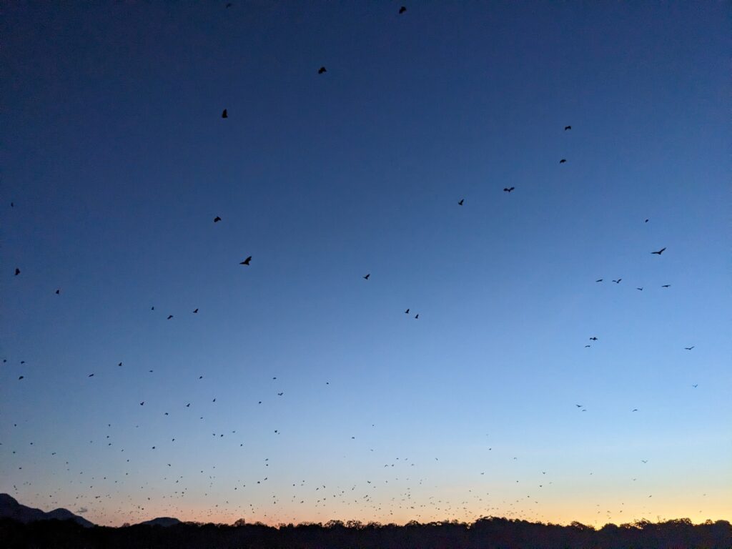 C’est un flot infini de chauve-souris qui nous survolent ! Nous n’attendons pas la fin car cela peut durer en continu pendant encore 3h !